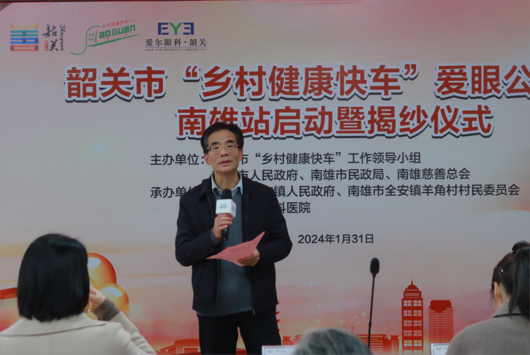 ? ? ? ?為了更好地滿足民眾眼健康需求,促進(jìn)鄉(xiāng)村振興建設(shè),將幫扶舉措進(jìn)一步落到實(shí)處,1月31日,由韶關(guān)市“鄉(xiāng)村健康快車”工作領(lǐng)導(dǎo)小組、南雄市人民政府、南雄市民政局、南雄慈善總會(huì)主辦,南雄市全安鎮(zhèn)人民政府、南雄市全安鎮(zhèn)羊角村村民委員會(huì)、韶關(guān)愛(ài)爾眼科醫(yī)院聯(lián)合承辦的韶關(guān)市“鄉(xiāng)村健康快車”愛(ài)眼公益行南雄站舉辦啟動(dòng)暨揭紗儀式。